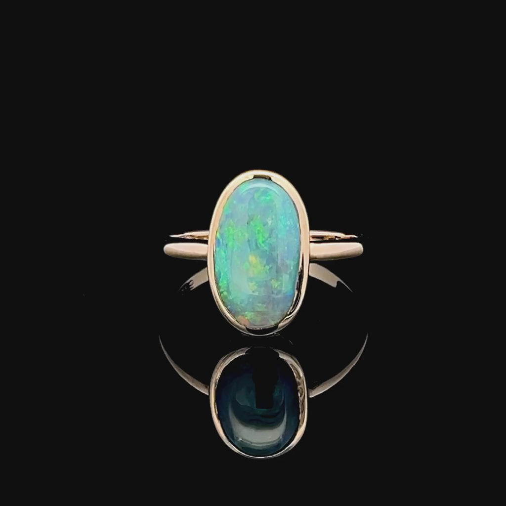 A stunning multicoloured Australian crystal opal ring that is bezel set and finished off in 9ct yellow gold. Beautifully modest, Allie brings a certain comfort and calmness to those around her. All of our opals are natural solid opals, sustainably and ethically mined in Australia. Ring has been handcrafted to suit the individual opal, making it a truly unique and one-of-a-kind piece.