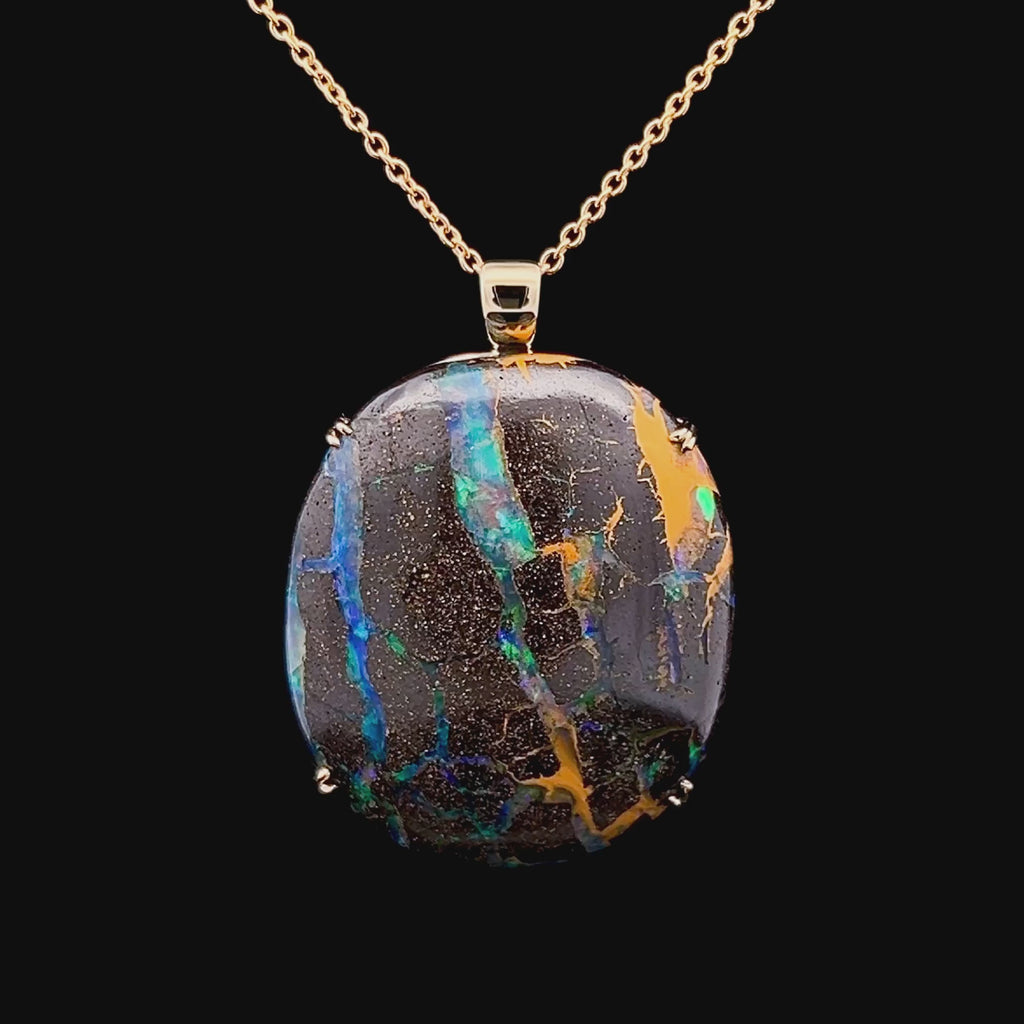 A unique opal pendant featuring a large 101.7ct blue-green Australian boulder opal set in 9ct yellow gold. Like lightning strikes in the night sky, the electric greens and flashes of blue strike vertically down the opal's face. The piercing colours in the opal's composition pop drastically against the darker shades of brown and orange boulder. All of our opals are natural solid opals, sustainably and ethically mined in Australia. This pendant has been handcrafted to suit the individual opal, making it a truly unique and one-of-a-kind piece.