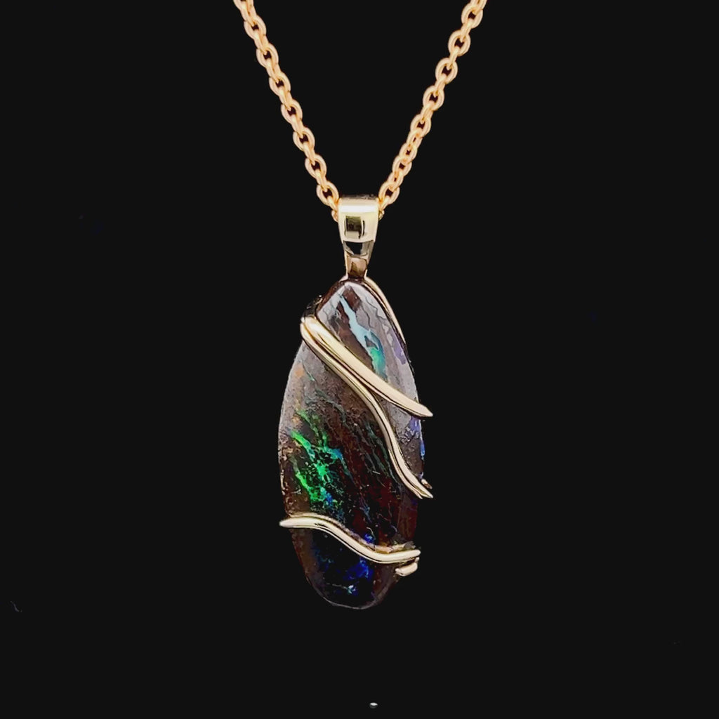 A unique opal pendant featuring an Australian Yowah boulder opal with yellow gold accent bands. Showcased against a natural ironstone matrix, vibrant blues and electric greens collide with the dark boulder to produce a subtle, yet stunning contrast. All of our opals are natural solid opals, sustainably and ethically mined in Australia. This pendant has been handcrafted to suit the individual opal, making it a truly unique and one-of-a-kind piece.