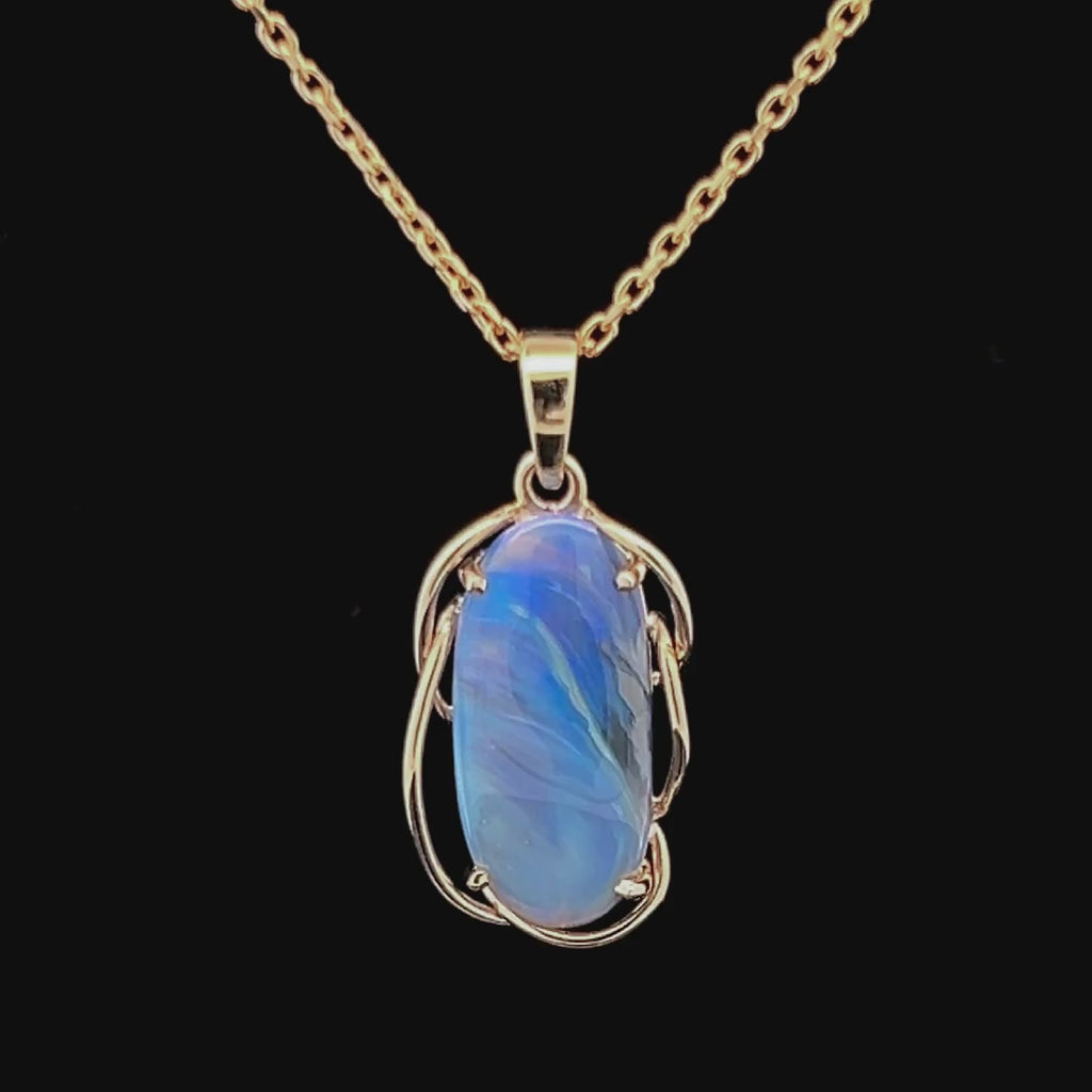 A beautiful blue Australian semi-black opal necklace handcrafted in a 9ct yellow gold wire cage design. Like wispy clouds that sweep across the sky on a breezy summer day, Kelsey's blue tones bring a sense of calm and tranquillity to those around her. All of our opals are natural solid opals, sustainably and ethically mined in Australia. This pendant has been handcrafted to suit the individual opal, making it a truly unique and one-of-a-kind piece.