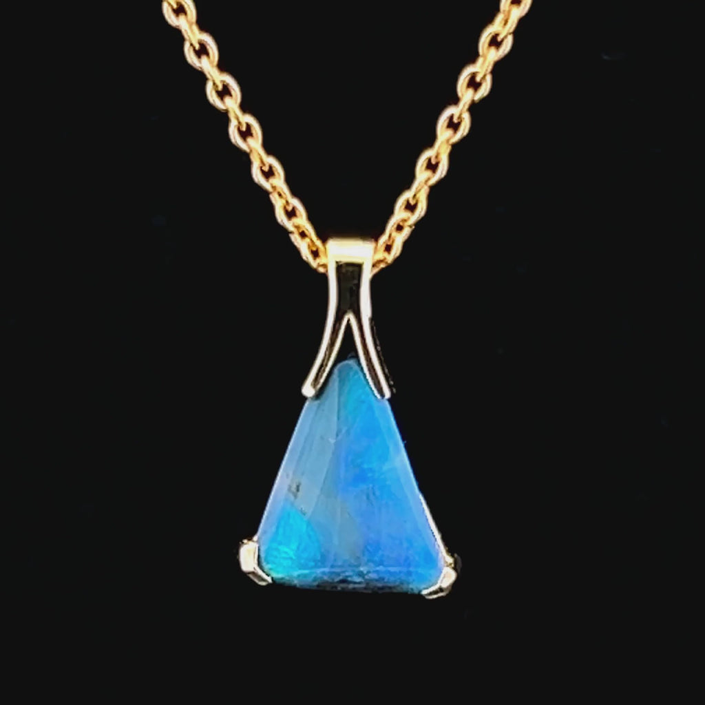 A stunning tri-cut blue Australian semi-black opal necklace handcrafted in 9ct yellow gold. Glowing with ocean tones and flashes of electric blue, Emi is a tiny treasure to be cherished until the end of time. All of our opals are natural, solid opals, sustainably and ethically mined in Australia. This pendant has been handcrafted to suit the individual opal, making it a truly unique and one-of-a-kind piece.