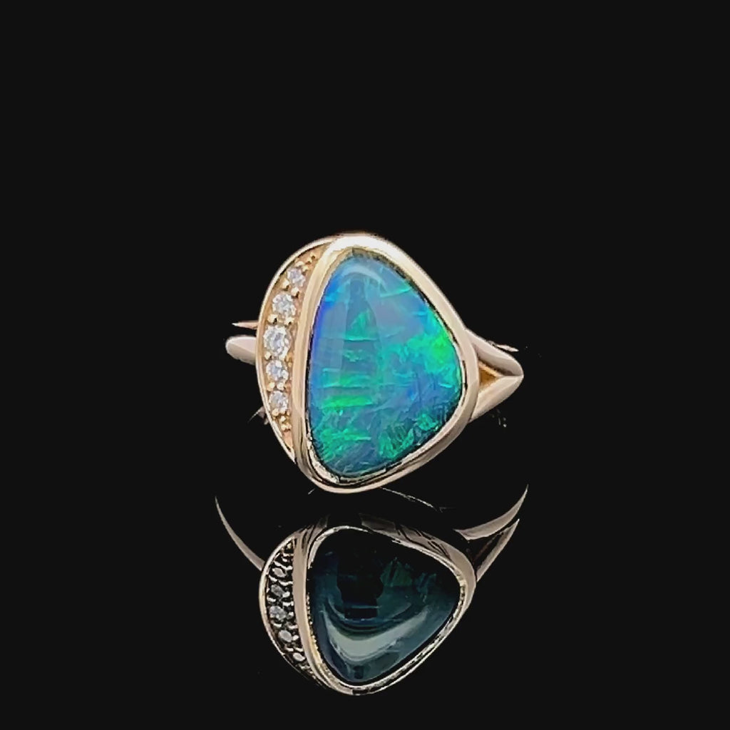 A stunning blue-green Australian semi-black crystal opal ring with 5 diamonds grain set and finished in 9ct yellow gold. Josie’s balanced symmetry is quietly comforting, while flashes of electric green ripple across her face, drawing you in for a closer look. All of our opals are natural solid opals, sustainably and ethically mined in Australia. Ring has been handcrafted to suit the individual opal, making it a truly unique and one-of-a-kind piece.