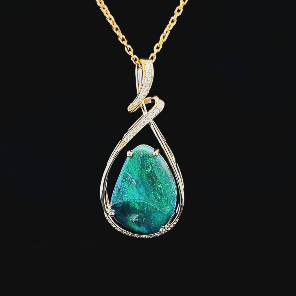 A stunning necklace featuring a blue-green Australian black opal set in 9ct yellow gold. Some extra time went into handcrafting the detailed setting of this opal by finishing it off with 32 brilliant cut diamonds that elegantly twist at its peak. Known for their striking play of colour against a dark background, Australian black opals are the most rare and sought-after type of opal. All of our opals are natural solid opals, sustainably and ethically mined in Australia. This pendant has been handcrafted to suit the individual opal, making it a truly unique and one-of-a-kind piece.