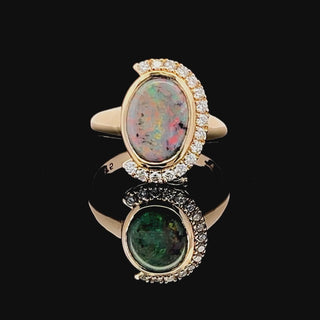 A stunning multicoloured Australian semi-black opal ring with a semi-diamond halo, finished in 9ct yellow gold. Scarlett's orange and hot pink flames contrast beautifully with her black flecks. All of our opals are natural solid opals, sustainably and ethically mined in Australia. Ring has been handcrafted to suit the individual opal, making it a truly unique and one-of-a-kind piece.