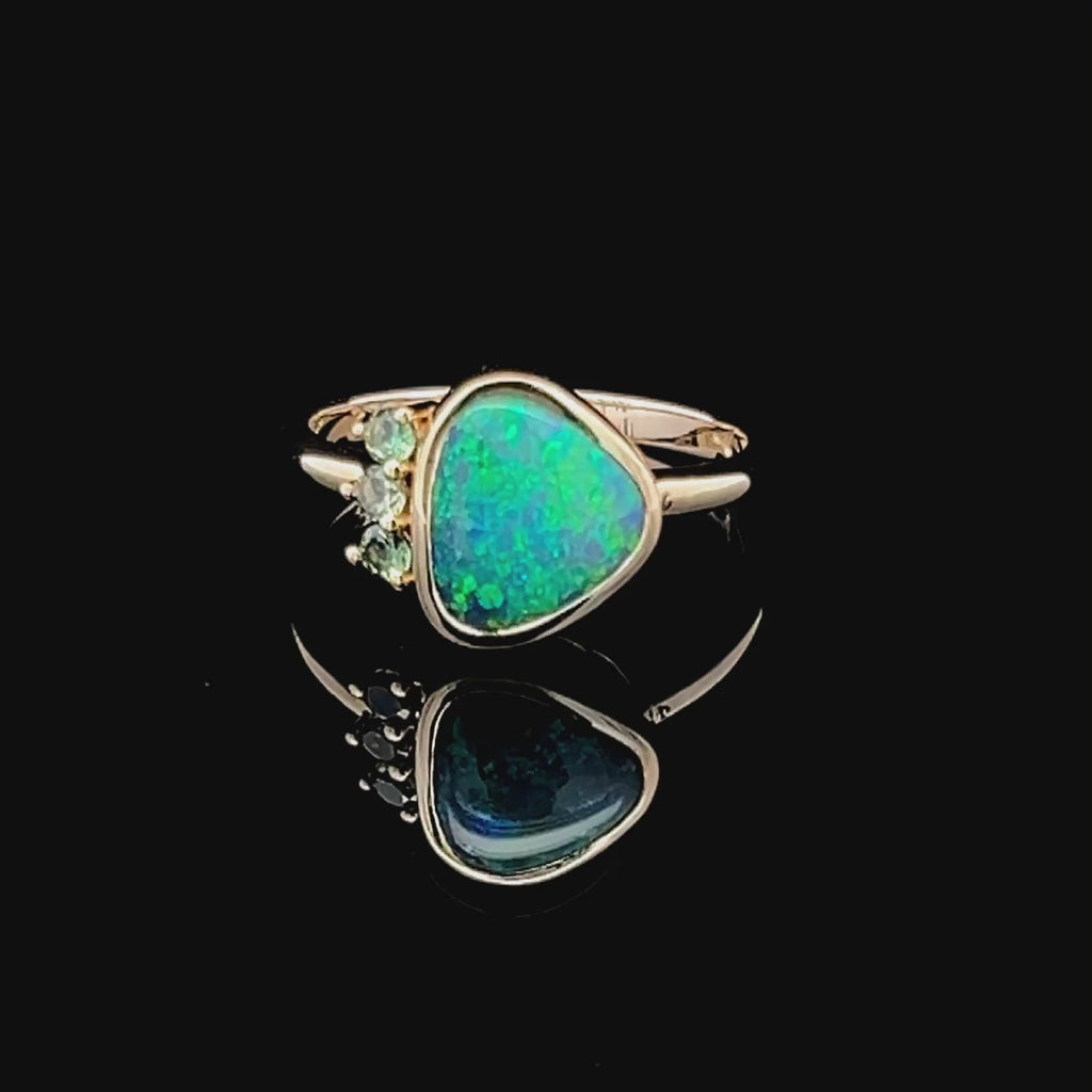 Seline | Green-Blue Australian Semi-Black Opal & Sapphire Ring