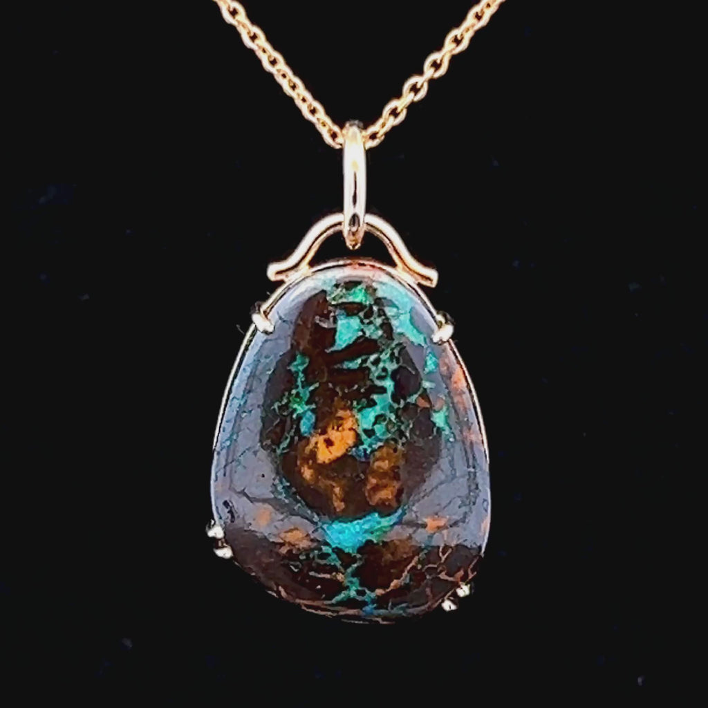 A stunning blue-green Australian boulder opal necklace handcrafted in 9ct yellow gold. The icy hues and glacial patterns of the opal pop through rocky, earthy sections of the boulder, evoking wonder and adventure. All of our opals are natural, solid opals, sustainably and ethically mined in Australia. This pendant has been handcrafted to suit the individual opal, making it a truly unique and one-of-a-kind piece.