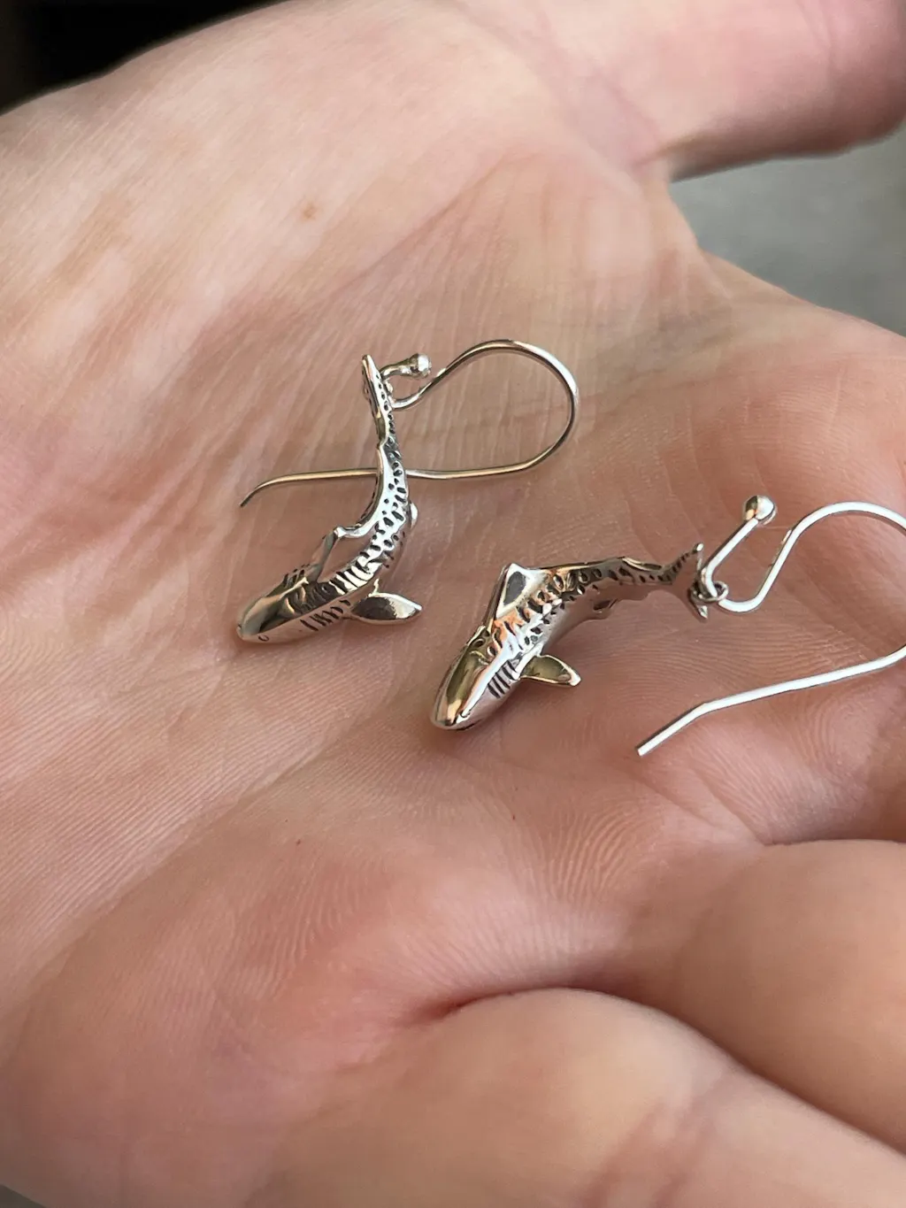 A pair of tiger shark earrings beautifully detailed with the distinctive stripes that give this shark it's name. As apex predators, tiger sharks are essential to the health of our marine ecosystems. Sadly they are considered a near threatened species due to excessive finning and fishing by humans. These earrings were designed to show off the incredible power and grace of these beautiful creatures and inspire love and respect for them rather than fear.